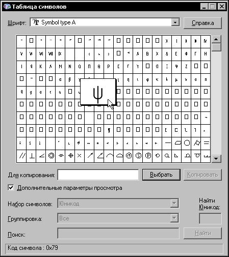 Чтобы определить начертание и код символа, можно использовать, например, стандартное приложение Windows Таблица символов (см. рисунок выше).