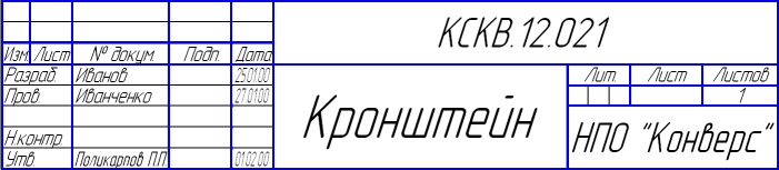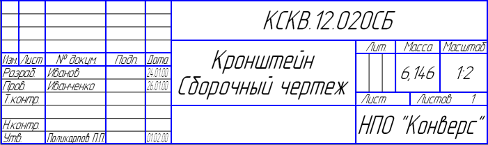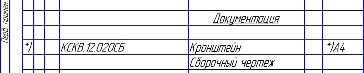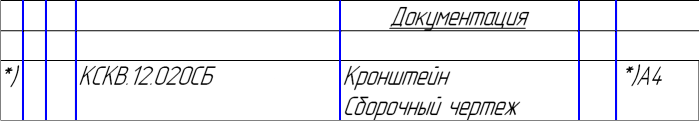 Пусть графы Обозначение и Наименование основной надписи спецификации содержат строки «КСКВ.12.020» и «Кронштейн» соответственно.