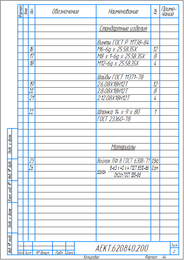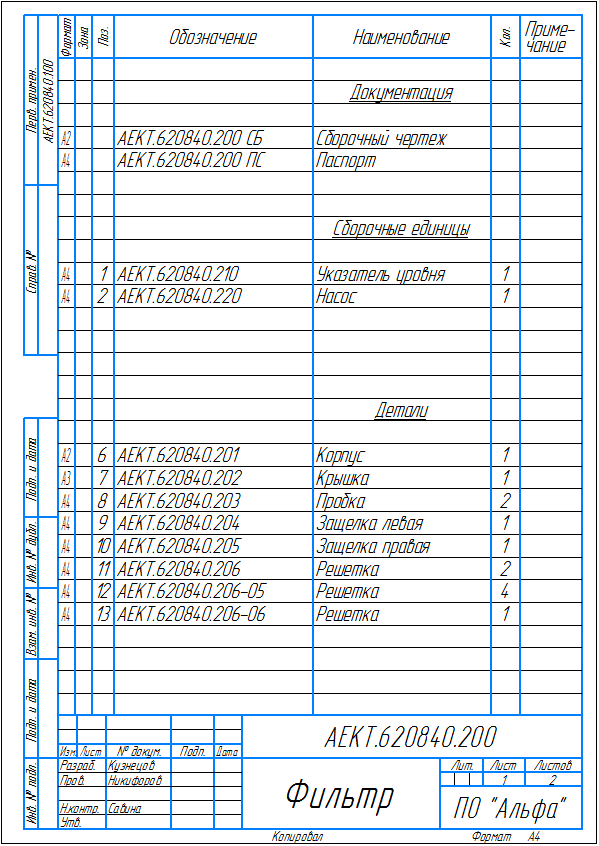 В начале изучения порядка работы со спецификациями КОМПАС-3D рекомендуется ознакомиться именно с этим способом, так как на примере созданной вручную спецификации хорошо видны многие приемы работы со спецификациями. Они будут рассмотрены в этом разделе на примере создания спецификации на изделие Фильтр, показанной на рисунке.