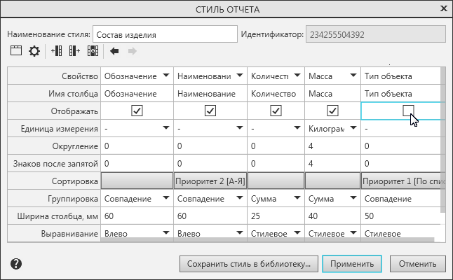 . Из списка в верхней ячейке столбца выберите свойство Тип объекта. Данное свойство добавляется исключительно для сортировки данных в отчете, показывать тип объекта в отчете не требуется. Поэтому отключите отображение свойства при помощи опции Отображать.