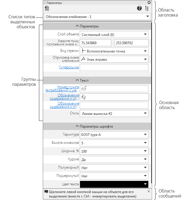 При выделении объекта в модели или графическом документе на Панели параметров отображаются и могут быть изменены параметры этого объекта (см. рисунок). Если выделено несколько объектов, то можно работать с общими для всех них параметрами или с параметрами объектов того или иного типа (для этого нужно предварительно выбрать тип объектов из списка).