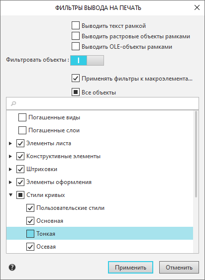 Иногда требуется вывести документ таким образом, чтобы некоторые объекты оформления или некоторые графические объекты не были напечатаны. Для этого используются фильтры. Установка фильтров вывода на печать выполняется в одноименном диалоге, см. рисунок. Чтобы вызвать этот диалог, нажмите кнопку Фильтры вывода... в диалоге настройки печати документов или специальной печати документов. Установка фильтров вывода, настроенная в диалоге, не изменяет умолчательных настроек системы. Описание элементов управления диалога приведено в разделе Диалог установки фильтров вывода на печать.