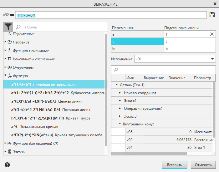 Диалог содержит перечень доступных для вставки элементов выражения. Они объединены в группы. В диалоге также содержится таблица с переменными текущего документа, которые можно вставить в выражение.