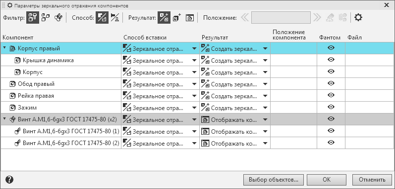 Параметры зеркального отражения и симметричной вставки компонентов задаются в диалоге Параметры зеркального отражения компонентов.