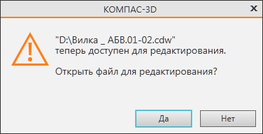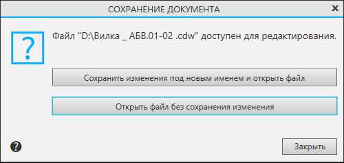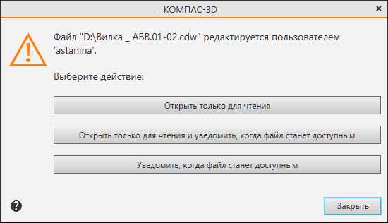 При попытке открыть документ, который уже открыт на другом рабочем месте, на экране появляется сообщение, показанное на рисунке.