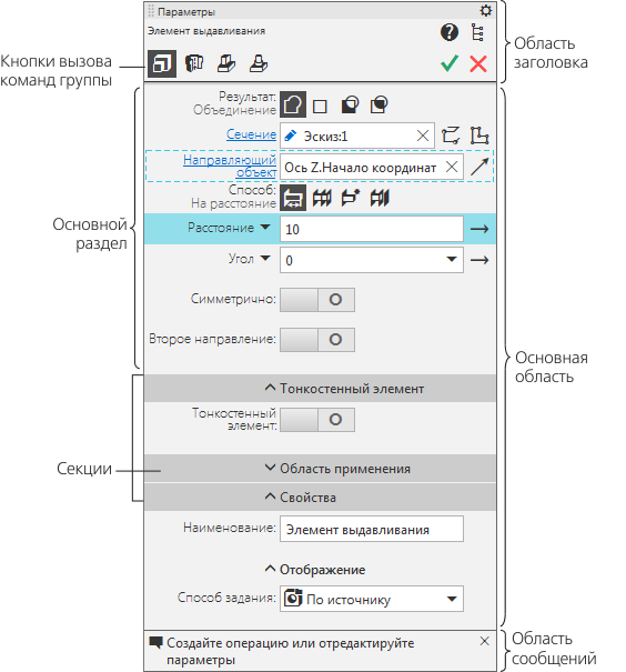 •Основной раздел — область, расположенная сразу после области заголовка. Основной раздел содержит элементы задания основных параметров выполняемой команды.