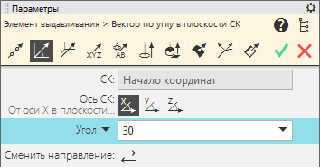 В некоторых командах из основного процесса можно перейти в подпроцесс. Например, при выполнении операции выдавливания можно запустить подпроцесс построения вектора, задающего направление выдавливания (см. рисунок). Индикатором подпроцесса является светло-желтый цвет области заголовка Панели параметров. Кроме того, к названию основного процесса через символ «>» добавляется название подпроцесса.