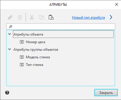 Чтобы присвоить групповой атрибут, выделите нужные объекты и выполните те же действия, что и при назначении атрибута отдельному объекту — одиночного атрибута (см. раздел Атрибут одного графического объекта. Атрибут документа). На рисунке показан диалог работы с атрибутами объекта, имеющего как одиночные (собственные) атрибуты, так и групповые (общие с несколькими другими объектами). Атрибуты содержатся в отдельных разделах списка: Атрибуты объекта и Атрибуты группы объектов.