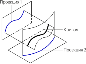Вы можете построить кривую на основе двух эскизов, расположенных в непараллельных плоскостях. Линии в эскизах считаются ортогональными проекциями создаваемой кривой на плоскости этих эскизов. Поэтому кривая создается как кривая пересечения двух поверхностей, образованных перемещением заданных проекций в направлениях, перпендикулярных их плоскостям, см. рисунок.