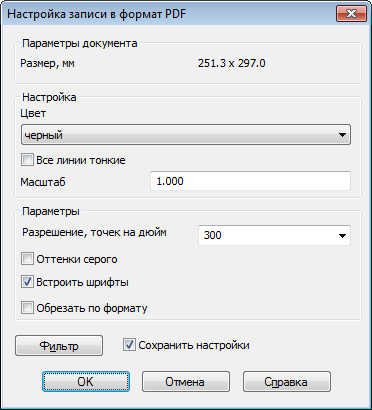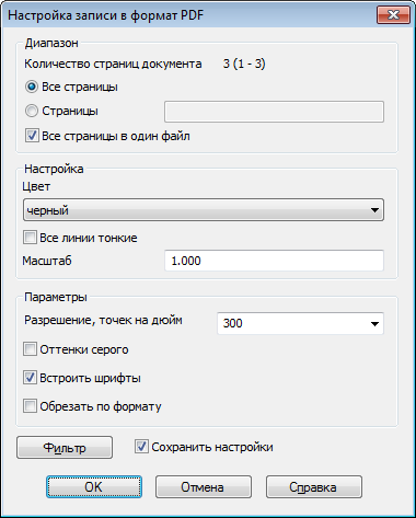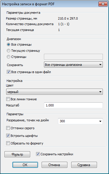 Диалог настройки записи чертежа или фрагмента в формат PDF