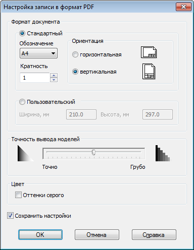 На рисунке приведен диалог настройки параметров записи модели в формат PDF.