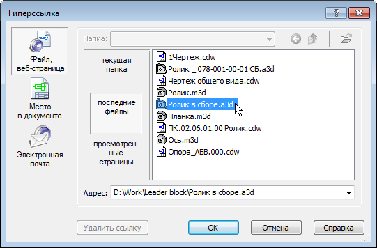 После выбора целевого объекта путь к нему или его адрес появится в поле Адрес. Вы можете ввести путь (адрес) с клавиатуры или выбрать из раскрывающегося списка Адрес путь (адрес), использованный в текущем сеансе КОМПАС-3D.