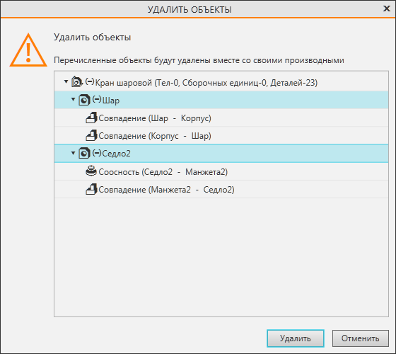 После вызова любой из команд удаления на экране появляется диалог-предупреждение. В нем отображается иерархический список, в котором: