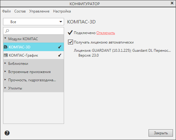 •Управление подключением модуля КОМПАС-3D и приложений.