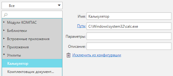 Если в списке Конфигуратора выбрана утилита, то набор элементов настройки содержит поля с информацией о ней. Эти поля доступны для редактирования.