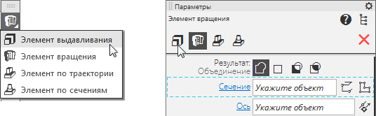 •эскиз, выбранный для выполнения операции выдавливания, остается выбран после переключения с выдавливания на вращение,