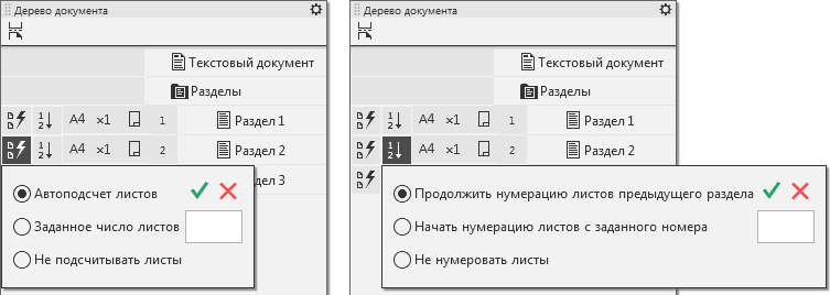 Настройка параметров нумерации для текущего документа выполняется в Дереве документа. Щелчок в поле подсчета листов вызывает диалог настройки подсчета, а в поле нумерации страниц — диалог настройки нумерации. Включите в каждом из диалогов нужную опцию и закройте диалог кнопкой Создать объект