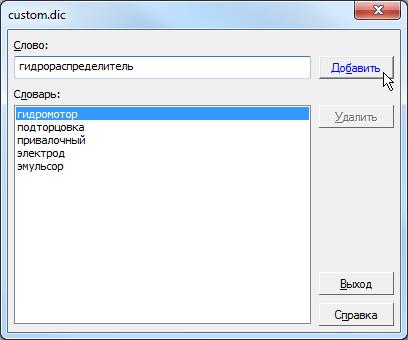 •чтобы добавить слово, введите его в поле Слово:, а затем нажмите кнопку Добавить,