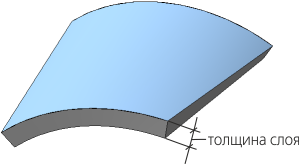 В процессе построения модели можно придать толщину граням тела или поверхности. В результате операции формируется слой, который представляет собой заполненное материалом пространство между исходной и эквидистантной поверхностями или двумя эквидистантными поверхностями (с двух сторон от исходной). Пример придания толщины грани поверхности показан на рисунке.