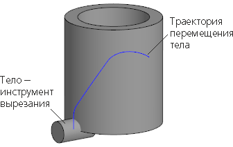 можно использовать для построения элемента по траектории тело, имеющееся в модели. В процессе выполнения операции данное тело будет перемещаться вдоль выбранной траектории и пересекать тела, входящие в область применения операции. Пример вырезания телом по траектории приведен на рисунке.