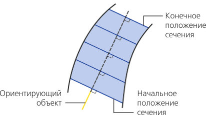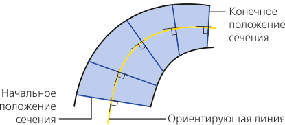 При способе движения сечения По линии положение плоскости сечения задается ориентирующей линией. В начальном положении сечения его плоскость располагается перпендикулярно ориентирующей линии. При движении сечения плоскость поворачивается так, чтобы оставаться перпендикулярной этой линии.
