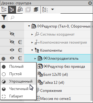 •Для компонентов возможна смена типа загрузки или на тип Полный, или на менее детальный по отношению к примененному (типы загрузки в порядке уменьшения детализации — Полный, Частичный, Упрощенный, Габарит, Пустой).