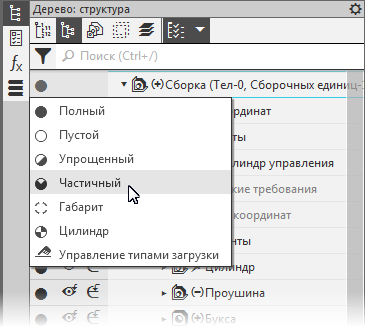 Чтобы применить другой тип загрузки сборки во время работы с ней, выберите его из списка типов загрузки в столбце типов загрузки Дерева построения. Для этого щелкните мышью по значку типа загрузки в строке корневого элемента Дерева и укажите нужный тип в появившемся списке (см. рисунок).