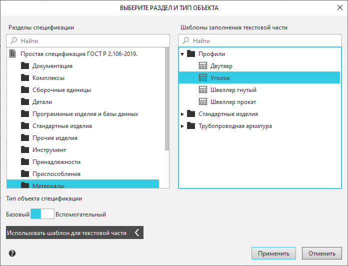 Выбор раздела Материалы и шаблона заполнения Уголок