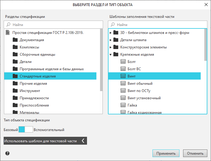 9.Щелкните по ссылке Использовать шаблон для текстовой части, в списке шаблонов раскройте раздел Крепежные изделия и выделите строку Винт, см. рисунок.