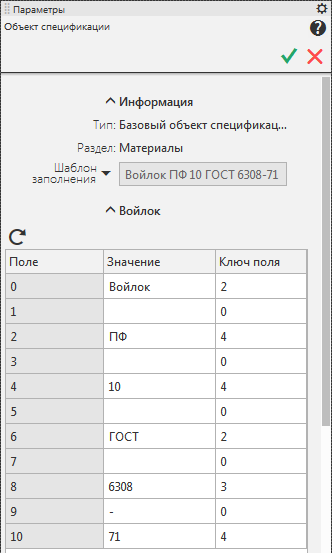На Панели параметров, помимо остальных элементов управления, отобразится секция Войлок с таблицей полей, на которые система автоматически разбила введенную строку, см. рисунок.