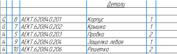 Таким образом, Крышка расположится в таблице спецификации перед Пробкой, т.к. последнее число в обозначении Пробки (203) больше последнего числа в обозначении Крышки (202).