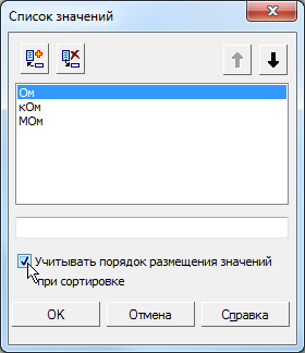 2.1. При вводе списка значений для седьмой колонки расположите строки в порядке: Ом, кОм, МОм (см. рисунок). При необходимости воспользуйтесь кнопками Переместить значение в списке вверх