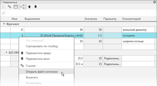 Чтобы быстро открыть файл-источник ссылки, воспользуйтесь командой Открыть файл-источник из контекстного меню переменной-ссылки (см. рисунок ниже). Команда доступна только для переменной, получающей значение по ссылке.