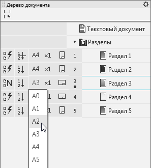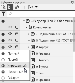Список объектов в Дереве документа представляет собой таблицу. Первые несколько колонок содержат поля, отображающие различные свойства объектов документа. Текущее значение свойства отображается в поле в виде пиктограммы. Щелчок в поле меняет значение на противоположное (если значений два) или раскрывает список значений, см. рисунок. Таким образом можно быстро скрывать и показывать объекты (в Дереве чертежа или модели), менять тип загрузки (в Дереве сборки), изменять формат листов (в Дереве чертежа или текстового документа) и так далее.