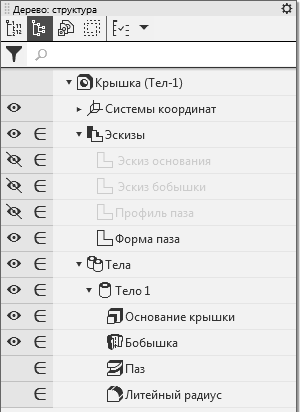 Состав Дерева построения можно настроить, включая/отключая отображение разделов. Подробнее...