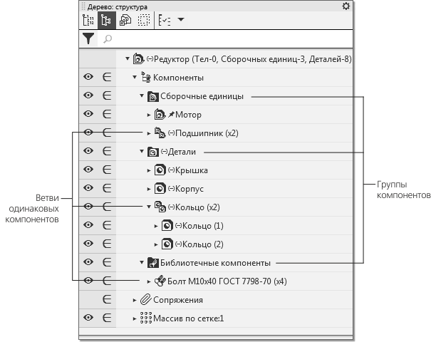 Модель может содержать одинаковые компоненты. Например, несколько одинаковых компонентов можно получить, создав массив. Одинаковые компоненты формируют ветвь в разделе Компоненты или в группе компонентов, объединенных по типу (группы отображаются в Дереве при включенной группировке, см. раздел Дерево модели). Название ветви образуется по шаблону: <Имя компонента> (хN), где N — общее количество одинаковых компонентов. На следующем рисунке показаны ветви одинаковых компонентов, а также группы компонентов, объединенных по типам.