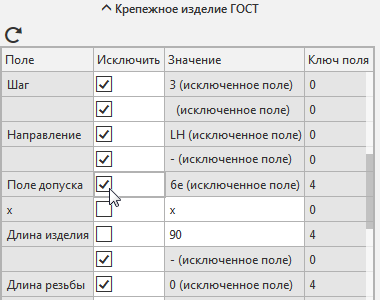 4.Если в редактируемом стандартном изделии поле допуска не показывается, то ячейка Значение выбранной строки имеет серый цвет и содержит текст «Исключенное поле:». В этом случае нужно сначала включить поле (т.е. сделать его значение доступным для редактирования, отображения и учета в сортировке).