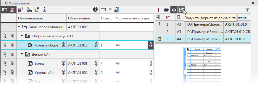 •Если в файле сборочной единицы не включено получение формата из какого-либо подключенного документа, например, чертежа, то автоматически включится получение формата из подключенной спецификации: для нее будет нажата кнопка Получать формат из документа