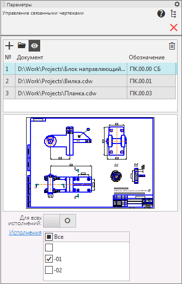 После вызова команды запускается процесс Управление связанными спецификациями или Управление связанными чертежами соответственно. На Панели параметров отображаются элементы управления чертежами или спецификациями, связанными с текущим документом.