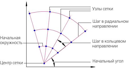 •угол между первой радиальной линией сетки и осью Х текущей системы координат в поле Начальный угол;