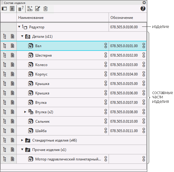 •Как и в спецификации, составные части на Панели состава изделия собраны в разделы и отсортированы. Однако, набор отображаемых на Панели состава изделия объектов и их свойств не зависит от текущего описания спецификации.