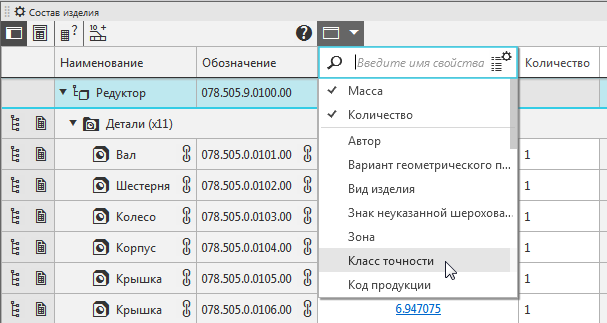 . Появится список доступных в текущей модели свойств. Те из них, которые уже отображаются на Панели состава изделия, отмечены «галочкой» и находятся вверху списка. За ними через разделитель следуют свойства, которые не показаны в таблице. Чтобы включить/отключить показ того или иного свойства, щелкните на нем мышью.