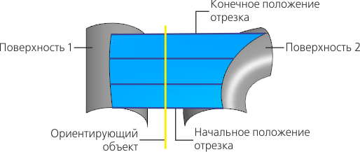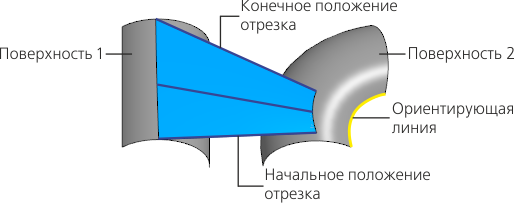 1.Задайте опорные поверхности — Поверхность1 и Поверхность 2. Отрезок-сечение линейчатой поверхности будет касаться обеих поверхностей — одной в начальной вершине, а другой в конечной.