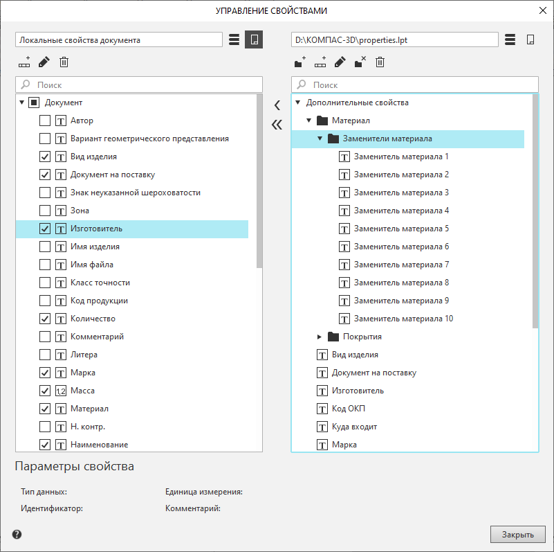 На приведенном выше рисунке показан вариант, когда в левом окне просмотра отображается список свойств текущего документа, а в правом — список свойств из библиотеки properties.lpt. Список свойств библиотеки может содержать разделы и подразделы.