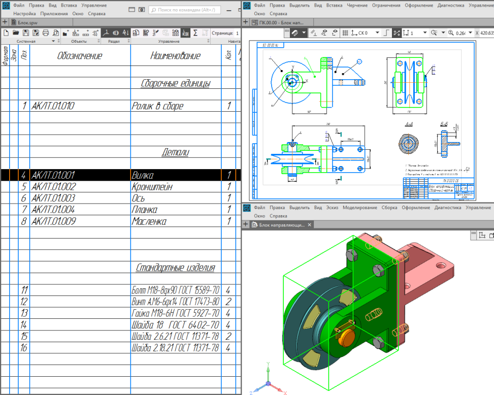 Если к спецификации подключены и сборка, и сборочный чертеж, то можно открыть оба этих документа и просматривать геометрию в них одновременно.