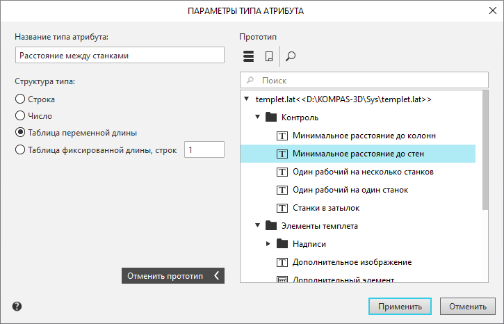 Для просмотра типа атрибута, выбираемого в качестве прототипа, в текущей библиотеке или документе выберите его из списка и нажмите кнопку. На экране появится диалог описания структуры атрибута. |