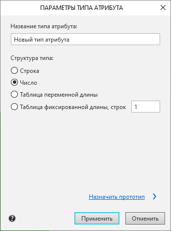 После того как описание нового типа атрибута закончено, нажмите кнопку Применить. Чтобы завершить диалог без создания нового типа, нажмите кнопку Отменить.