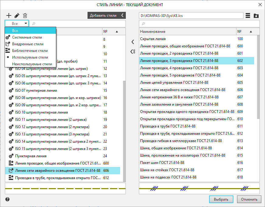 Выделив в списке нужный стиль, нажмите кнопку Выбрать, чтобы установить для линии указанный стиль. Для выхода из диалога без сохранения изменений нажмите кнопку Отменить.