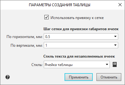 Эта группа опций доступна, если включена опция Использовать привязку к сетке. Вы можете задать значение шага По горизонтали и По вертикали. Габариты ячеек сформированной таблицы будут кратны указанным значениям. |