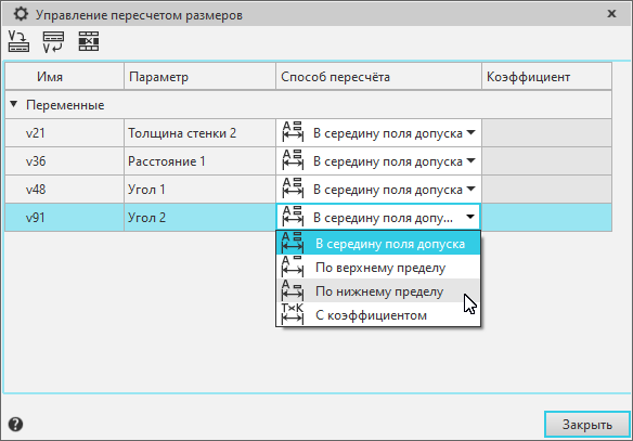 •Способ пересчета — предназначена для выбора способа пересчета значения переменной; каждая ячейка колонки содержит раскрывающийся список способов пересчета: в середину поля допуска, по верхнему пределу, по нижнему пределу, с коэффициентом (см. таблицу Способы пересчета размеров модели).